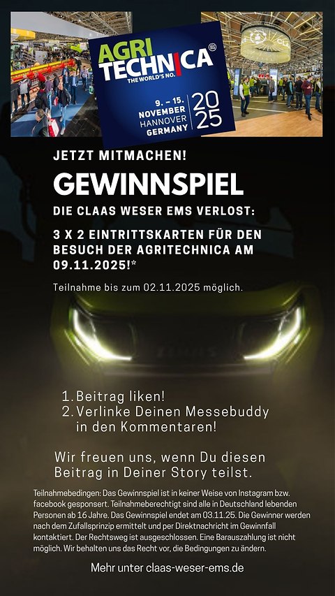 Die CLAAS Weser Ems GmbH verlost 3 x 2 Eintrittskarten für den Besuch der Agritechnica am 09.11.2025.