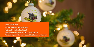 Die CLAAS Weser Ems GmbH bedankt sich für die Zusammenarbeit und wünscht allen Kunden, Lieferanten und Mitarbeitern erholsame Festtage und einen guten Rutsch ins neue Jahr.