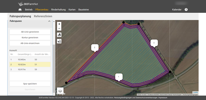 Für jeden Schlag wird eine Auswahl möglicher Fahrspuren erstellt. Anhand von Kennwerten, wie die Anzahl der Wendungen, kann die individuell effektivste Fahrspur an das Lenksystem übermittelt werden. Zudem können Fahrspuren auch als Shape-Datei exportiert werden. Mit der Festlegung einer optimalen A-B-Linie für Ihre Schläge, können zusätzlich Arbeitszeit und Dieselkosten eingespart werden, für eine effiziente und ressourcenschonende Boden-und Feldbearbeitung.